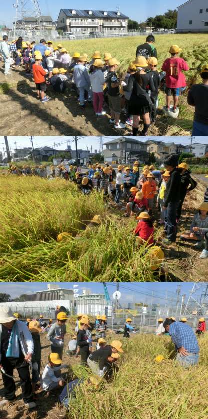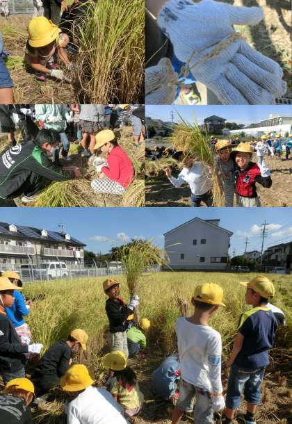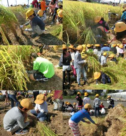 10月17日(金)、3年生が稲刈り体験をしました。6月4日に田植えをした稲が大きく成長し、3年生全員で稲刈りをさせていただきました。はじめに稲の刈り方を教えてもらい、一株ずつていねいに刈り取りました。3株を一つの束にしばり、3束ずつ稲刈りをしました。はじめて稲刈りをする子どもたちがほとんどでしたが、何度も稲を刈らせていただくうちに自信を持って刈り取るようになりました。これまで協力していただいた地域のみなさん、そしてJA尾張中央の方々、貴重な体験をさせていただき、ありがとうございました。