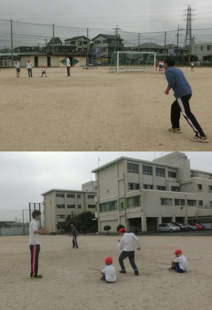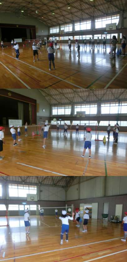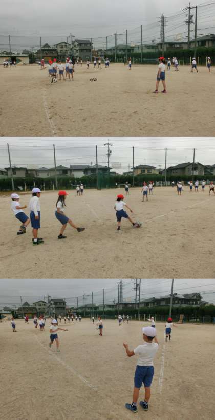 10月21日(火)、3・4年生と5・6組の体育授業のようすです。3年生はキックベース、4年生はソフトバレーボールに、試合形式で取り組んでいました。5・6組は、明日の「けやきの子運動会」に向けて、徒競走のスタート練習をしていました。