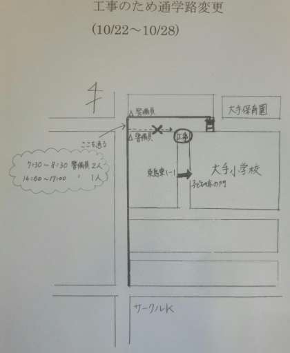 10月21日(火)、通学路が変更になる通学班の児童に話をしました。雨水調整池工事に伴う導水管敷設のため、明日22日(水)から28日(火)まで、一部の通学班の通学路が変更になります。プールの北西角の道路で工事が行われ、プール沿いの歩道を通る通学班が対象となります。児童の登下校時には、ガードマンによる安全な誘導が行われます。よろしくお願いします。