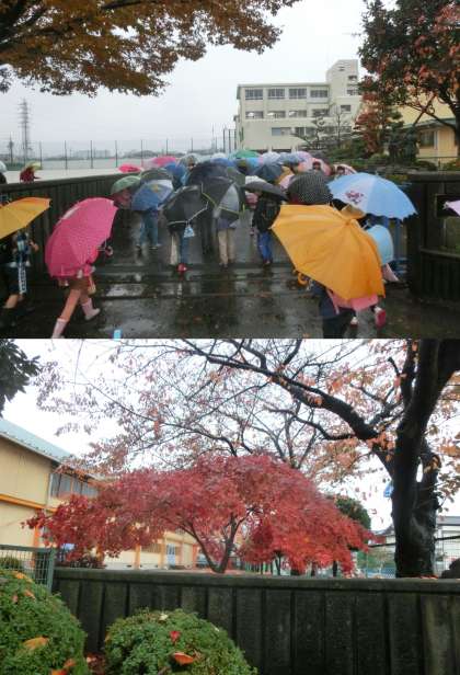 11月26日(水)、昨日に続いて今日も朝から雨が降っていました。正門には傘の花でいっぱいでした。一雨ごとに紅葉が深まり、正門横のもみじも赤くなってきました。