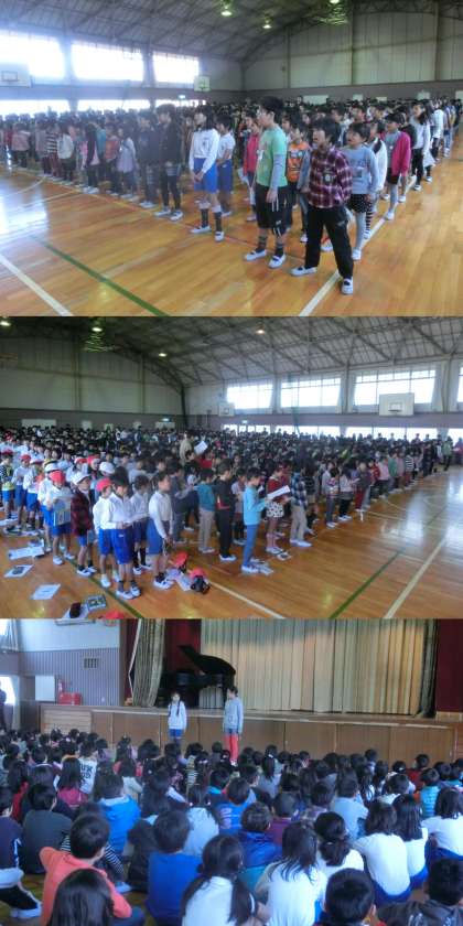 11月27日(木)、今月の「歌声集会」を行いました。今日の歌声集会では、11月の歌の 『夢の世界を』と来週の芸術鑑賞会の曲『また会う日までさようなら』を歌いました。「夢の世界を」は、語りかけるような歌い方で、体育館に美しい歌声が響き渡りました。