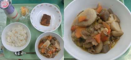11月28日(金)、今日の給食献立は、「発芽玄米ごはん・牛乳・『いも煮』・生揚げのごまみそかけ・柿」でした。