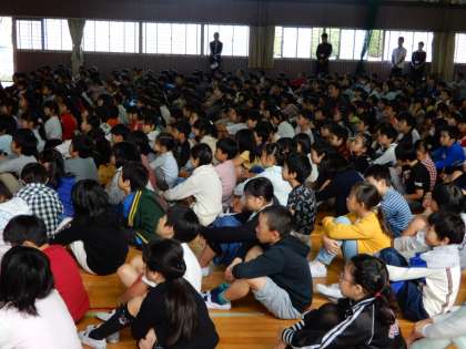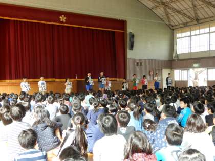 今日の朝会は、後期の児童会役員、委員会委員長、学級委員の任命式が行われ、正式に前期から後期へバトンタッチが行われました。写真は、前期児童会役員の一人ひとりから、活動の振り返りと児童会活動協力への感謝の言葉が述べらている場面です。最後に、前期役員へ感謝の大きな拍手が贈られました。また、任命式の後には、10月27日に行われる席上揮毫大会選手紹介が行われ、全校児童から激励の拍手が贈られました。