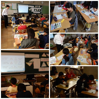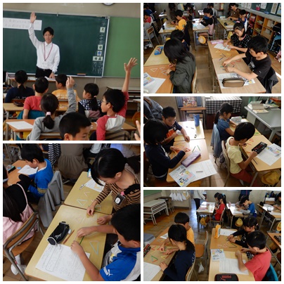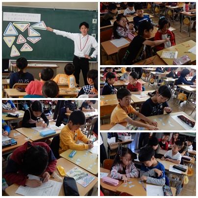 教育実習の先生が3年生の算数で研究授業を行いました。いろいろな長さのストローを使って三角形を作ります。辺の長さに注目して、できた三角形を分類しています。教える先生も教わる子ども達も一生懸命です。今日の授業で正三角形と二等辺三角形の定義を考え理解することができました。
