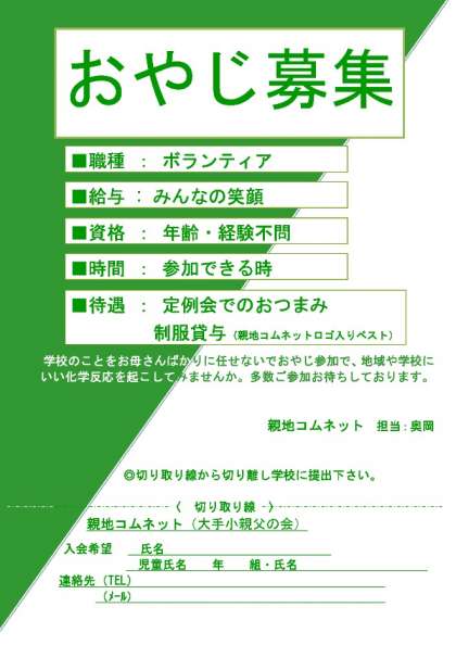 「親地コムネット」(大手小 親父の会)では、活動にご協力していただける方を随時募集しています。この会は、発足して2年半のこの会の活動の目標は、