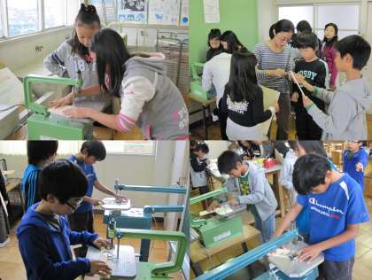 11月8日(木)、5年生の図画工作授業のようすです。電動糸のこぎりを使って、一枚の板から伝言板を作っていました。何度も電動糸のこぎりを使ううちに、直線だけでなく曲線も上手に切ることができるようになってきました。