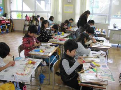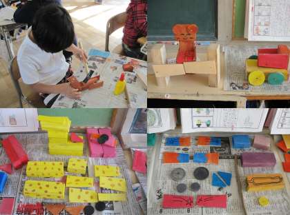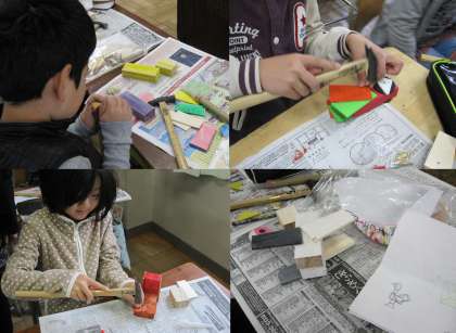 3年生図画工作 『トントンサクサク 木の名人』 公開日 2012/11/12 更新日 2012/11/12 3年生 11月12日(月)、3年生の図画工作授業のようすです。『トントンサクサク 木の名人』の単元で、金づちやのこぎりを使って木で作品を作る学習です。前の時間までに設計図をもとにのこぎりで切り出した部品に色を塗り、今日は金づちと釘を使って、部品を組み合わせて完成させました。はじめは金づちでうまく釘を打てなかった子も、だんだんと上手に打てるようになりました。