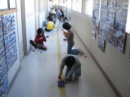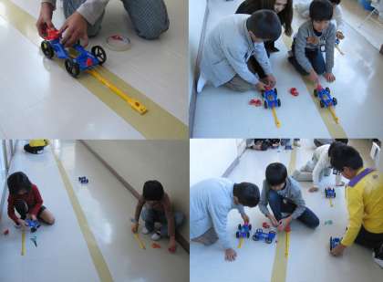 11月19日(月)、3年生の理科授業のようすです。3年生は、風やゴムには物を動かす働きがあり、風の強さやゴムをのばす長さの違いによって物の動き方に違いがあることを学びます。今日は、学習のまとめとして、ゴムの力で模型の車を動かしていました。