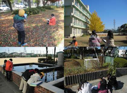 2年生生活科 『 冬のはじまりをさがそう 』 公開日 2012/11/21 更新日 2012/11/21 2年生 11月21日(水)、2年生の生活科授業のようすです。今日は、校内で、「冬のはじまり」を探していました。枝に残っている葉や落ち葉、鮮やかな黄色になってきたイチョウの葉、すっかり枯れているコスモスなど、色々な場所で冬のはじまりを見つけていました。校内の樹木は紅葉も本格的になり、秋の深まりとともに冬の足音を感じます。