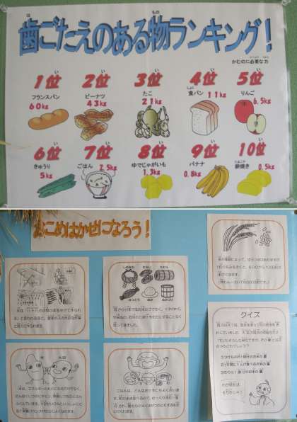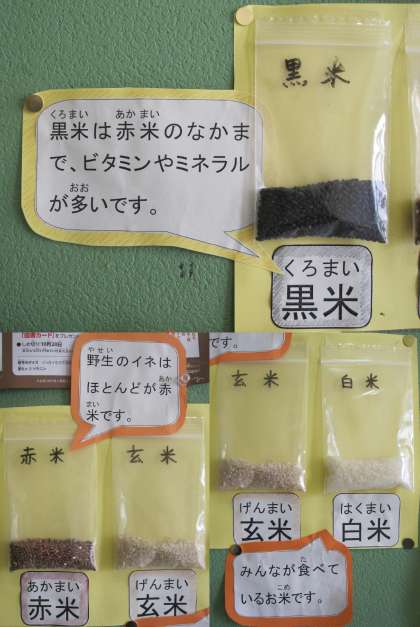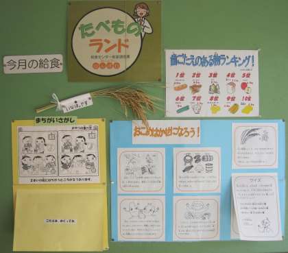 栄養士さん作成の今月の 『たべものランド』 です。11月の献立目標は、「かみごたえのある食材を食べよう」です。歯ごたえのある食品が、ランキングで紹介されています。ランキング7位で給食の主食であるごはんの原材料「お米」について、わかりやすく紹介されています。日頃食べている白米や玄米といっしょに、昔から食べられていた赤米と黒米も実物が展示されています。学校においでの際は、職員室廊下の掲示板をご覧ください。