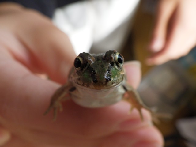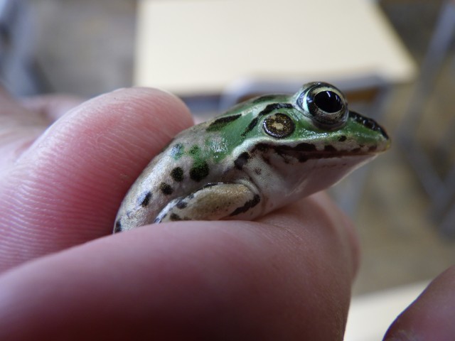 ダルマガエルとトノサマガエルはよく似ています。背中の模様、目の黒いラインの模様からすると「ダルマガエル」だと思います。が、もしかしたら、トノサマとダルマの雑種かもしれません。