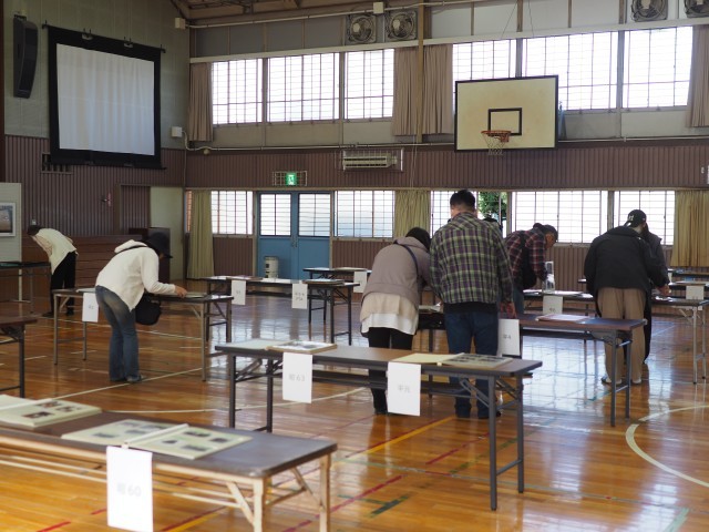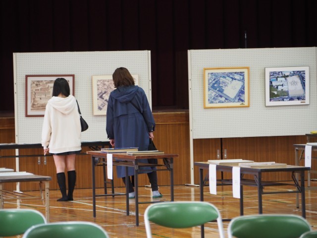 同時に、開校50周年を記念して、体育館で「思い出の写真展」を開催しました。これまでの50年間の航空写真のパネルや、懐かしい行事写真のアルバムなどを皆様にご覧いただきました。たくさんの方が足を止め、写真を見ながら「あの時は...」と懐かしそうにお話される姿が印象的でした。