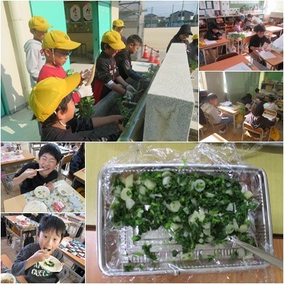 その後、間引いたばかりの小さな大根を丁寧に洗い、家庭科室の鍋でゆでて、シンプルにしょうゆをかけてみんなで味わいました。間引いた大根とはいえ、自分たちで育てた野菜の味は格別で、「おいしい!」とたくさんの笑顔が見られました。食への感謝を深める貴重な学習となりました。