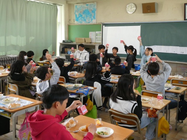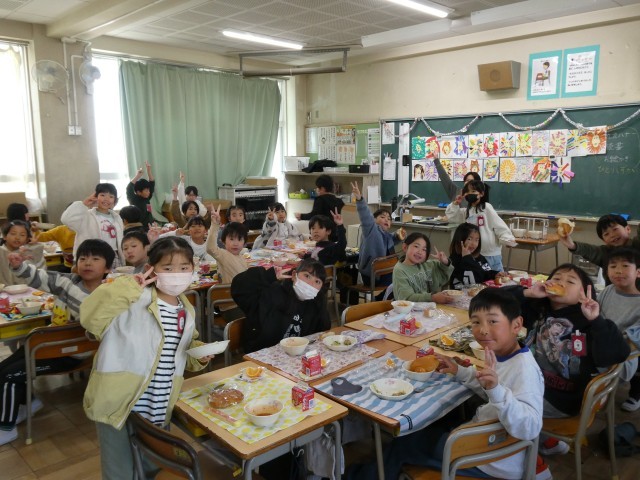今日は、今年度最後の給食でした。メニューは、クロスロールパン、牛乳、ポークビーンズ、ブロッコリーサラダ、オレンジ。「1年間おつかれさまでした!」と牛乳で乾杯をしている楽しそうな姿も見られました。この1年間で、子どもたちは好き嫌いなく色々なものを食べることができるようになり、大きな成長が感じられました。学校給食に関わってくださった皆さん、子どもたちのために1年間おいしい給食をありがとうございました。明日は修了式です。
