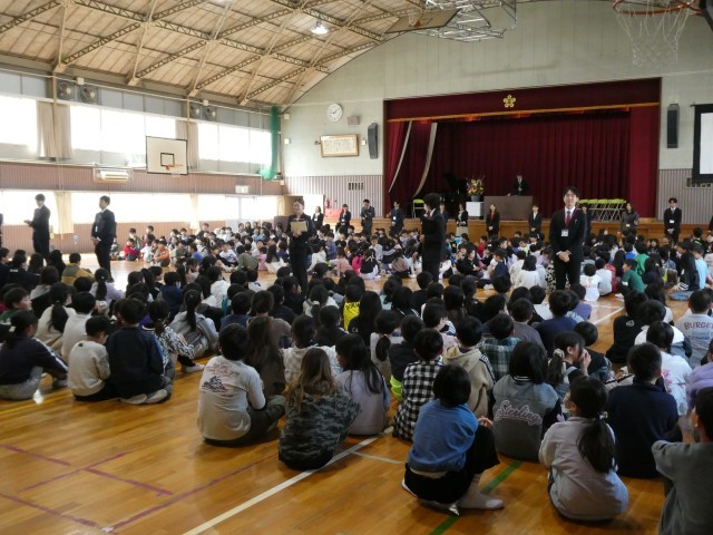 本日、令和8年度の着任式・始業式を行いました。校舎に掲示されたクラス発表で歓声を上げた子どもたちは、体育館へ。今年度は1年生から6年生まで、全校児童538名でスタートします。
