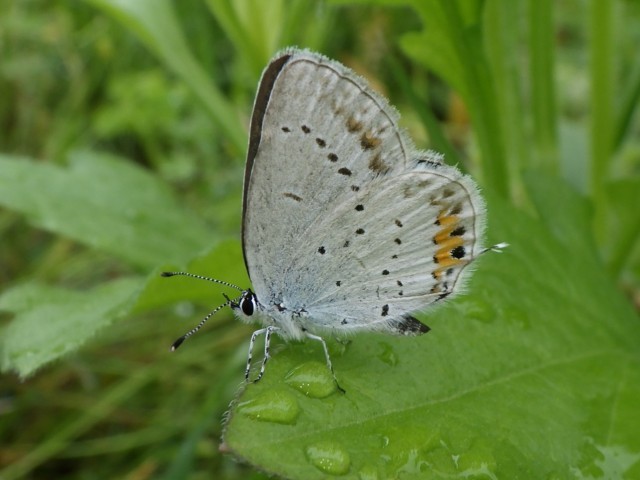 翅の後ろ、下の方にチョロっと出ているところがツバメに似ているので「ツバメシジミ」オレンジ模様も特徴的ですね。