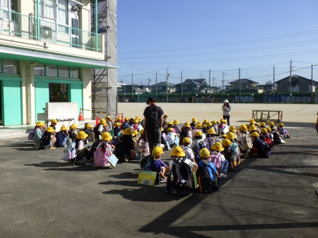 警察の方と市役所の方が見守りをしてくださいました。みんな大きな声であいさつをし、白バイやパトカーに興味津々でした。