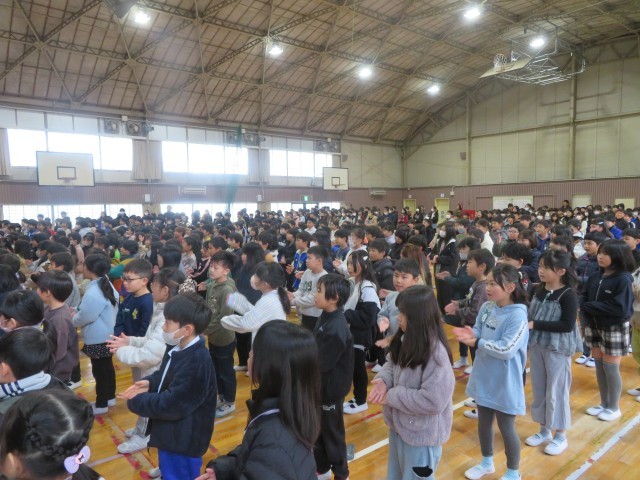 本日、朝会を行いました。教頭先生からは、3学期の登校日が残り約30日であることを踏まえ、「残り30日のスイッチ」を入れて、次学年に向けた学習やクラスの思い出作りなど、一日一日を大切に過ごそうという話がありました。会の最後には、音楽委員が「ミュージックタイム」を行い、「ありがとうの花」を手話とともに歌いました。この曲は「6年生を送る会」で全校発表する予定です。本番に向け、心を込めて練習を重ねていきます。
