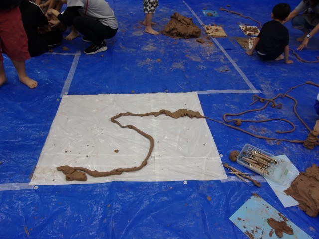 10月16日(木)、5~9組で、かすがい市民文化財団の講師の方による出前授業がありました。最初に、粘土の粉から泥団子を作りました。水と粘土の粉がなかなか混ざらず苦労していましたが、最後にはみんな上手に丸く作ることができました。次は、土粘土140㎏を9組教室前面にちりばめて、高く積み上げたり、長くつなげたりして、思いのままに粘土で楽しみました。