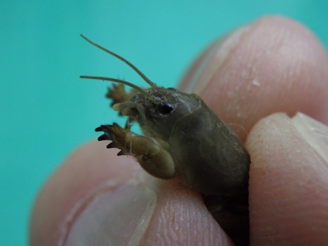 キリギリスの仲間です。大あごが真っ赤で、この子にかみつかれて無理に引っ張ったりすると、首がもげてしまうらしいです。「クビ」「キリ」のキリギリスで「クビキリギス」なんですね。かまれた方もかんだ方も痛そうなので、そっと触りましょう。