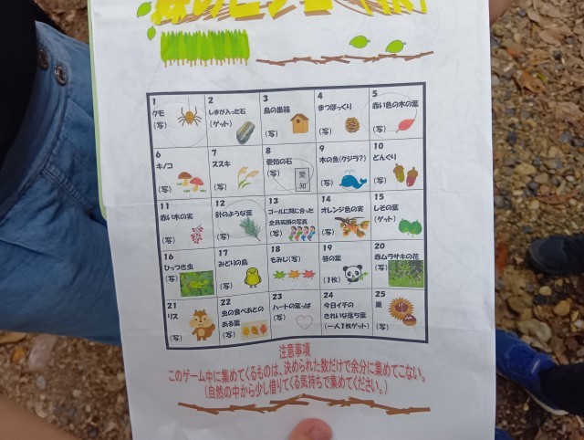 ビンゴにある「まつぼっくり」「くり」「赤い木の実」など、探して写真に撮っています。