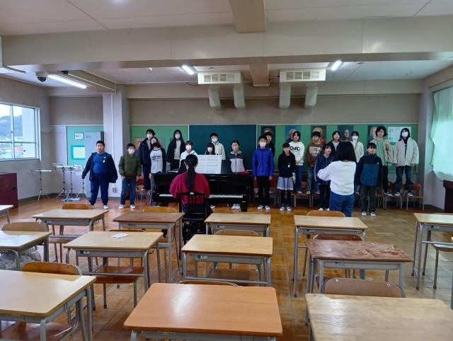 6年生は音楽室、1~5年生は音楽室とオンラインでつなぎ、教室でおこないました。