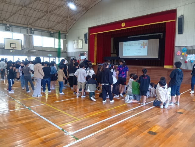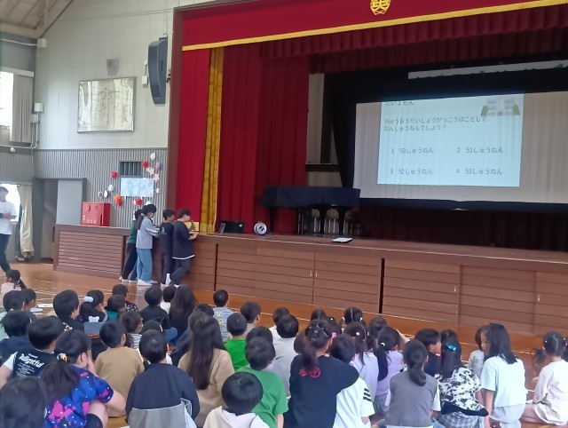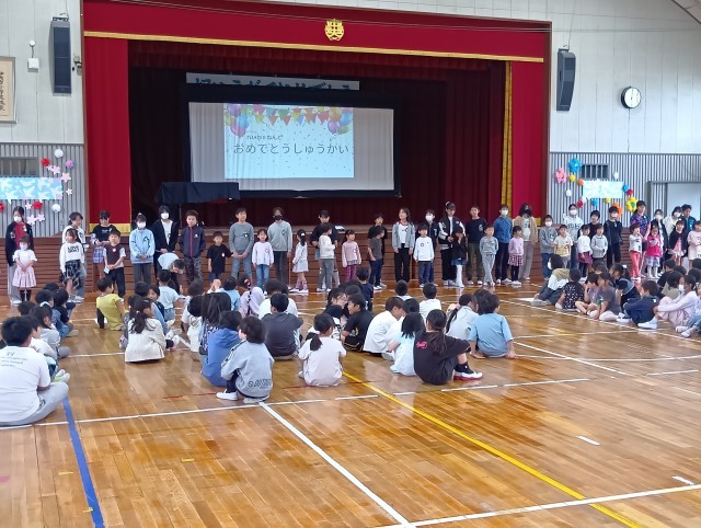 おめでとう集会の様子です。「ようこそ中央台小学校へ!」