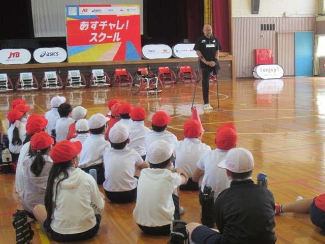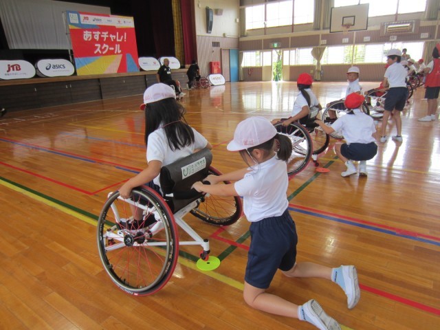 10/2(木) 4年生対象にパラスポーツ体験型出前授業「あすチャレ!スクール」(主催:日本財団パラスポーツサポートセンター)が行われました。初めは少し緊張気味の子どもたちでしたが、徐々に講師の先生の話に引き込まれていきました。また競技用の車いすでのリレーや車いすバスケットボールの体験は、とても盛り上がりました。子どもたちから感想やお話を聞いてください。