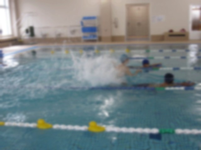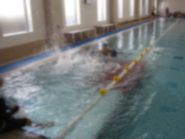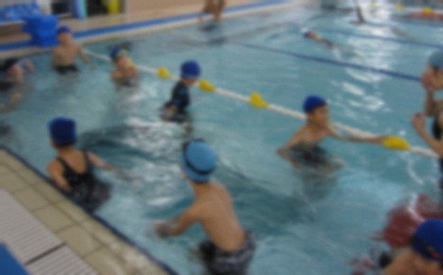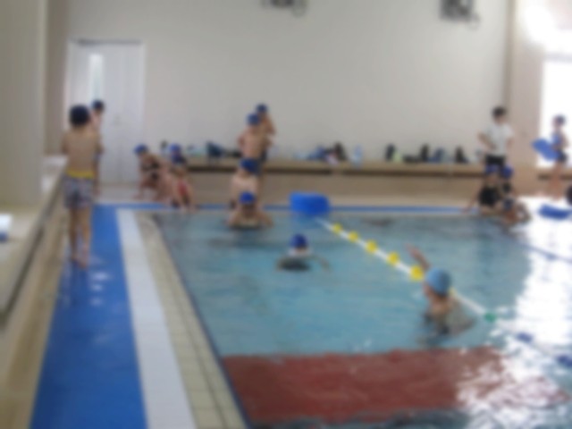 アミスポーツで、泳力別に4つのグループに分かれ、バタ足、水中じゃんけん、クロール、平泳ぎなど、泳力に合わせた泳ぎ方を練習していました。