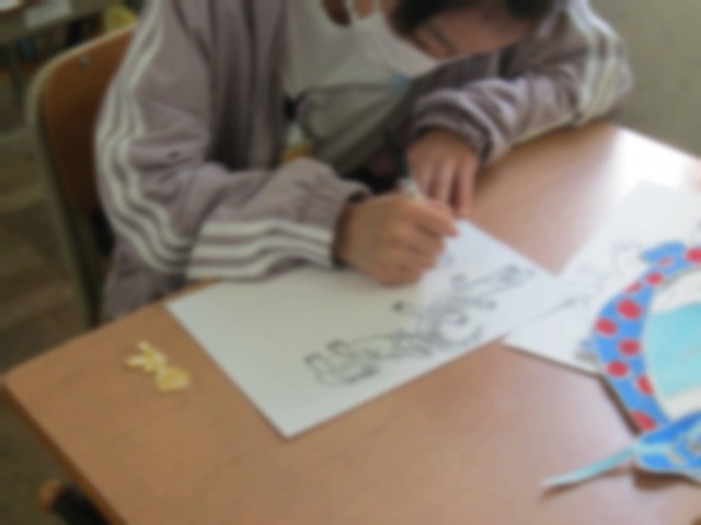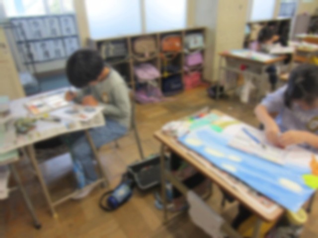 図工の時間です。造形展の作品の次は、読書感想画に取り組んでいます。【エルマーのぼうけん】の本の読み聞かせのあと、本の登場人物たちや風景を想像して画用紙に描いています。りゅうって??きょうりゅうに似ている??ライオンってどう描こう??ジャングルって何があるだろう??と最初は、なかなか難しいようでしたが、少し本物の動物たちを画像で見て研究し描き始めています。締め切りも近いので、子どもたちも集中して取り組んでいます。出来上がりが楽しみです。