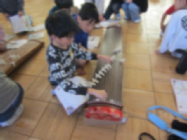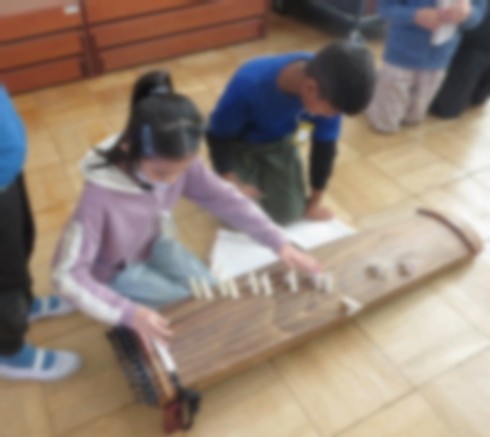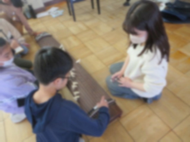 いよいよ、自分たちが角爪をつけて、「さくらさくら」の練習に入ると、真剣な顔で取り組んでいました。糸(弦)をつまびくのは、想像以上に力が必要だったり、思ったような音が出せなかったりして、始めは悪戦苦闘していましたが、廣岡先生や倉橋先生が順番に回って指導してくださり、次第に曲らしくなっていくと、微笑んでいました。