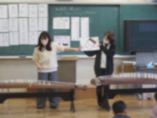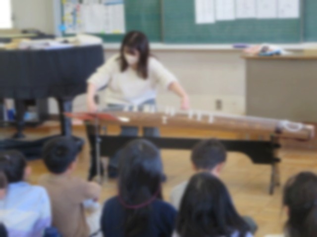 7日、3・4時間目に学年でお箏の授業を行いました。倉橋先生に加え、特別講師に1年生の廣岡先生(師範の資格を持ってみえます。)を迎え、お箏の歴史や、楽器の仕組みのお話から始まり、楽譜の読み方と演奏方法を教えていただいた後、廣岡先生の演奏を聴きました。すてきな音色に子どもたちは聞き入っていました。