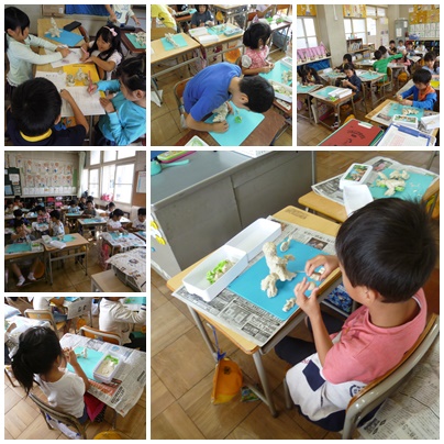 図工♪いっしょにおさんぽ 公開日 2016/10/21 更新日 2016/10/21 1年生の出来事 粘土を使って、自分と仲間の楽しく散歩する様子を表現しました。それぞれ素敵な作品を作りました。最後にお友達の作品の良いところを見つける鑑賞会をしました。