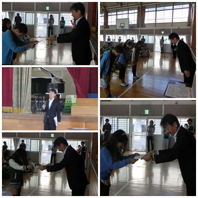 今日の朝会では、赤い羽根共同募金とバスケットボールの表彰、