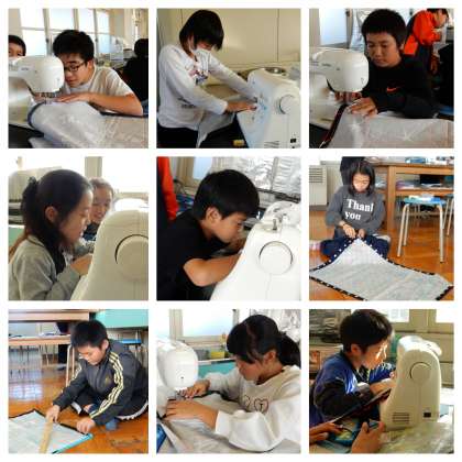 5年1組です。エプロンを作っています。もうミシン縫いをはじめた子もいました。