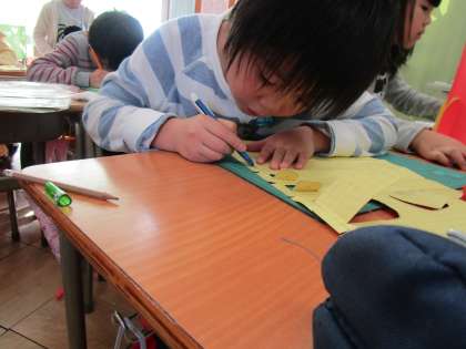 カッターを使って、窓を作っています。手を切らないようにと真剣です。すてきな作品ができるといいですね!