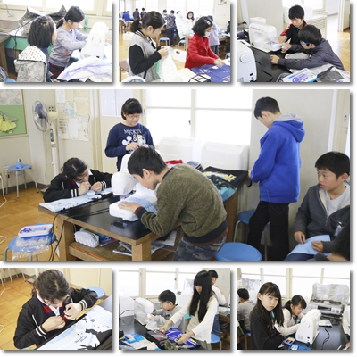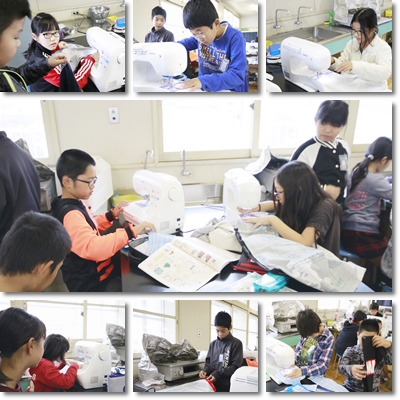 ミシンを使ってエプロンをつくっています。