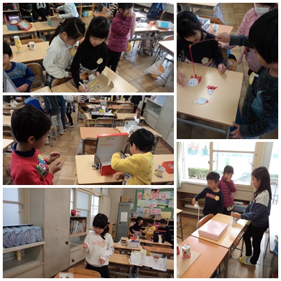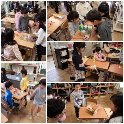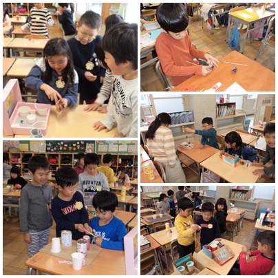 秋みつけで見つけたものや家から持ってきたものを使って、おもちゃを作りました。すぐに材料を用意して持ってきた子がいたり、木の実や葉っぱをたくさんつけてかざり付けをする子がいたりなど、楽しく制作をすることができました。最後に、みんなで作ったおもちゃを使って遊びました。どのおもちゃも、楽しく遊ぶことができました。