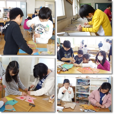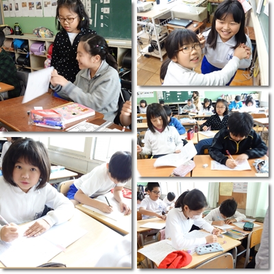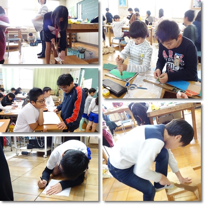 最後は3階、4年生の教室へ。 北斎などをまねて描いていました。