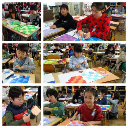 正方形、長方形、直角三角形を使って、すき間のないように模様を作っています。