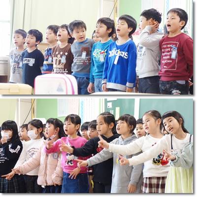 2年生が歌の練習をしています。声が大きくて元気! 振り付けもステキです。