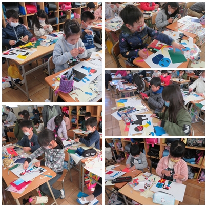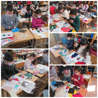 図工で色版画をしています。テーマは、冬休みの思い出です。タックシールを切って貼るという細かい作業に苦労しながら頑張って版づくりをしています。