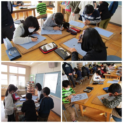 4年生の図工の様子です。 似顔絵を描いて彫っています。