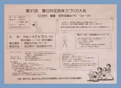 2月10日(日)に西部ふれあいセンターで「春日井区民体力づくり大会」が行われます。地域の行事に参加するのはとてもいいことだと思います。ご都合がよければ、ぜひ、家族で参加してください。