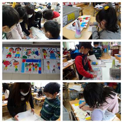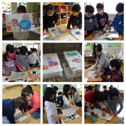 協力して版画の印刷をしていました。 上の写真が1組、下の写真が3組です。