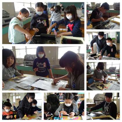 2組の図工です。 紙版画ができた人から印刷しています。手が真っ黒になっていました!