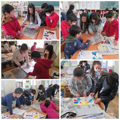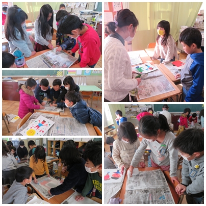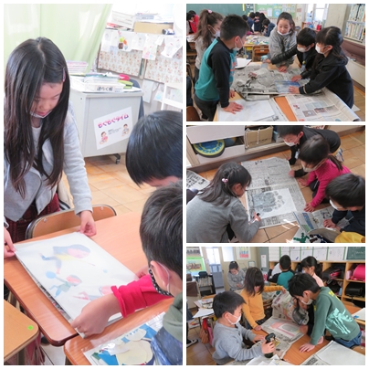 版画をグループで協力して印刷しました。とても楽しそうでした。できた作品を教室に貼りました。学習発表会の際にぜひご覧ください。