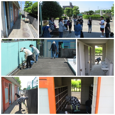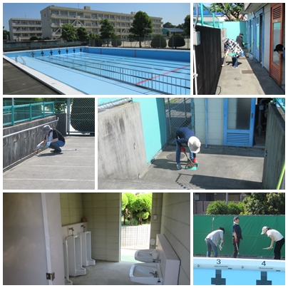 PTA行事部の皆さんにプール清掃をしていただきました。プールサイドや更衣室、トイレは、落ち葉、ほこり、泥などがたまり、ずいぶんよごれていましたがきれいなりました。本日はお忙しい中、誠にありがとうございました。