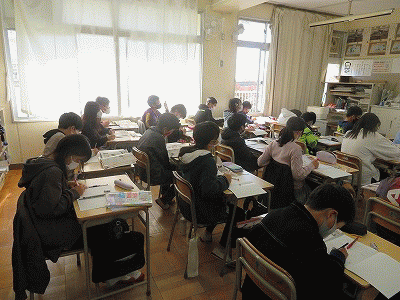 社会の授業では、幕末の開国や倒幕の動きについて学びました。外国語の授業では、英語を使って環境問題について考えました。他にも松山チャレンジを行っているクラスやその練習を行っているクラスがありました。