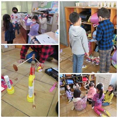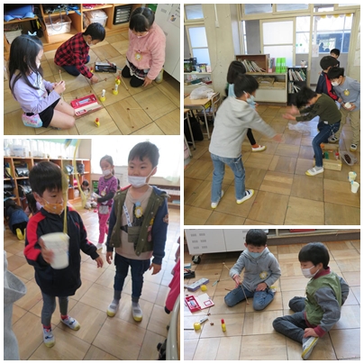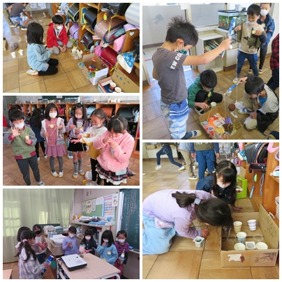 生活科で、秋のフェスティバルをしました。校外学習で拾ってきたドングリやマツボックリなどを使っておもちゃを作り、みんなと楽しく遊べるように、これまでに試行錯誤しておもちゃを工夫してきました。やじろべえがつり合うようにしたり、振るとひらひらと飾りが動くようにマラカスの飾りを工夫したりと、子どもたちなりに考えて工夫してきました。きょうは、それを使って、みんなで遊びました。みんなで話し合った遊びのルールやめあてをきちんと守り、音楽に合わせてマラカスを振ったり、まと入れの点を競い合ったりしながら、なかよく楽しく遊べました。材料の準備へのご協力ありがとうございました。